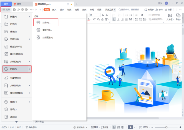 首先打开需要打印的PPT文档,点击左上角的文件,选择打印。