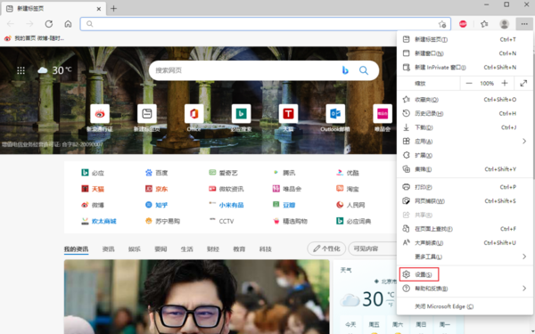 首先打开Edge浏览器,点击右上角的菜单,选择设置。