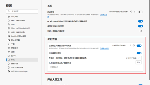 将优化性能下方的使用标签页休眠功能节约资源开启即可。