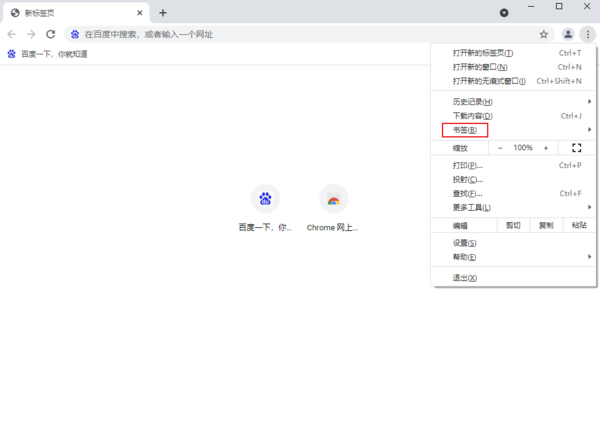 之后点击谷歌浏览器右上角的菜单,选择书签。