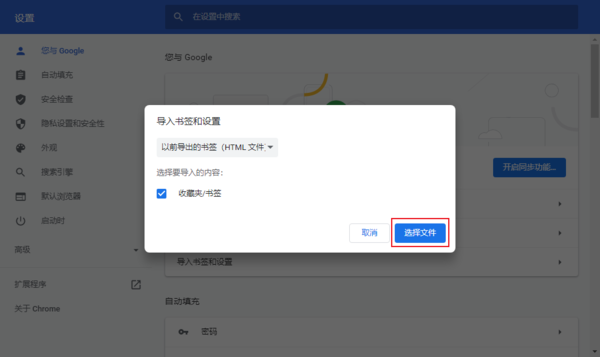 点击选择文件,将其他浏览器导出的书签添加到谷歌浏览器即可。