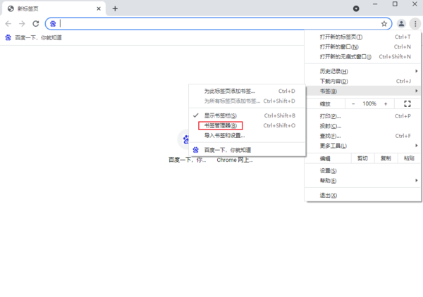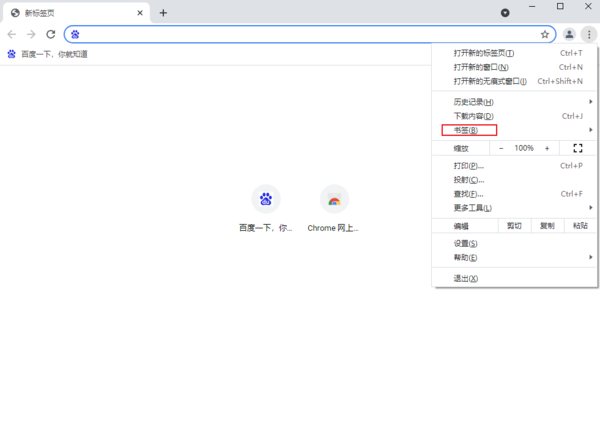 首先打开谷歌浏览器,点击右上角的菜单,选择书签。