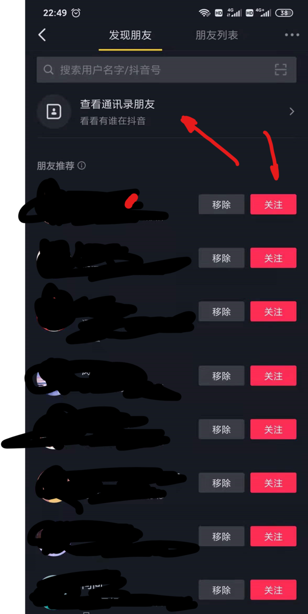 第三步,我们能看到有朋友推荐、查看通讯录朋友,如果找不到对方就直接在搜索框搜索对方的用户名或抖音号就能找到那名好友。