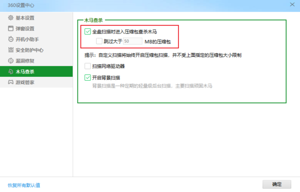 将全盘扫描时进入压缩包查杀木马功能勾选,之后点击确定即可。