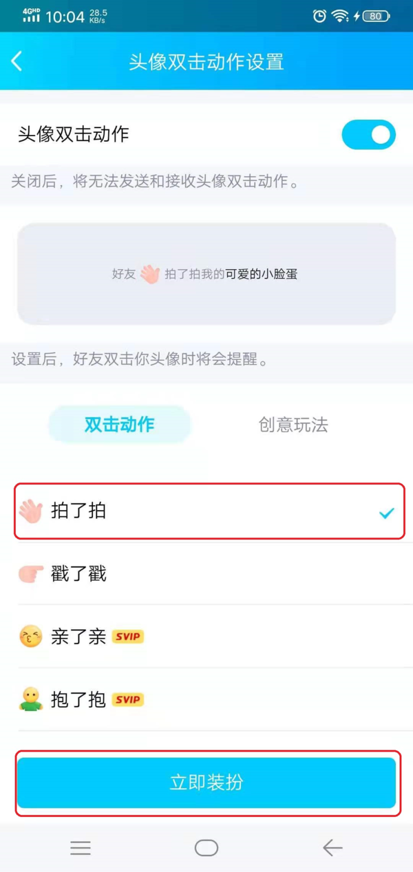第七步,然后在【双击动作】选项下,我们可以设置双击头像的动作,比如默认的【戳一戳】,或者是【拍一拍】、【揉一揉】等。这里我们选择【拍一拍】功能,最后点击【立即装扮】按钮。