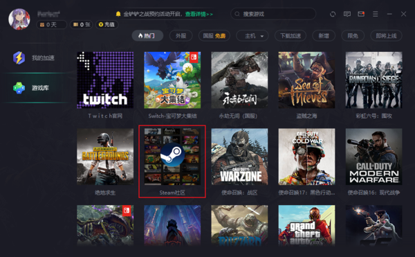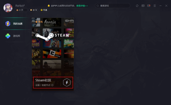 选择任意一款网游加速器,在游戏库中选择Steam社区,将其添加到加速列表中。