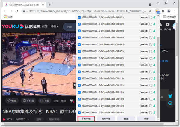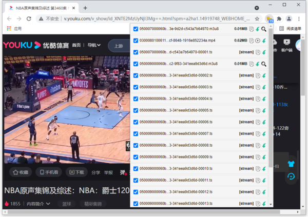 以优酷为例,当播放视频时,猫抓插件就会自动读取网页中的所有视频源。