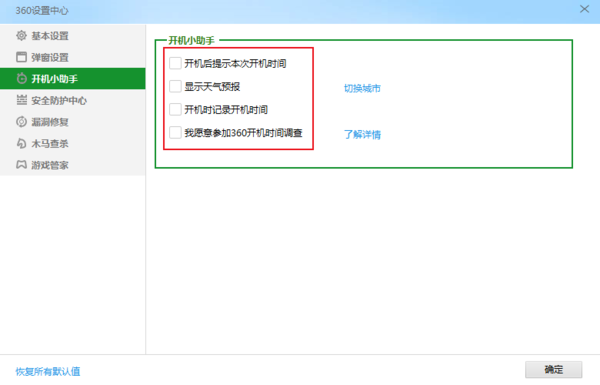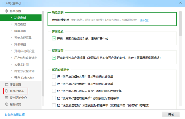 将开机小助手中开启的功能取消勾选,点击确定即可。