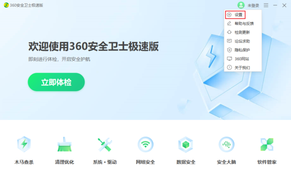 首先打开360安全卫士,点击右上角的菜单,选择设置。
