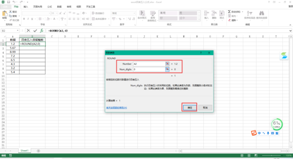 第五步,然后软件就会在B2单元格中输入【=ROUND()】函数,并弹出【函数参数】的窗口,此时我们将【Number】的数值选择为【A2】,然后在【Number_digits】中输入【0】,最后点击【确定】按钮。