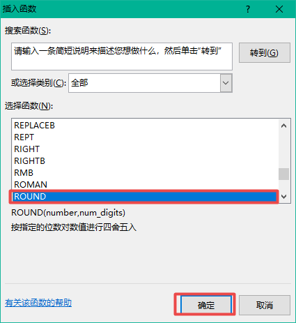 第四步,接着在【选择函数】中,找到【ROUND】并选择它,最后点击【确定】按钮。