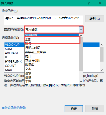 第三步,然后软件就会弹出【插入函数】的窗口了,此时我们点击【或选择类别】后面的【常用】选项,然后选择【全部】。