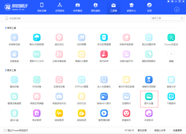 首先打开爱思助手,点击上方的工具箱,找到图片去重功能并点击。