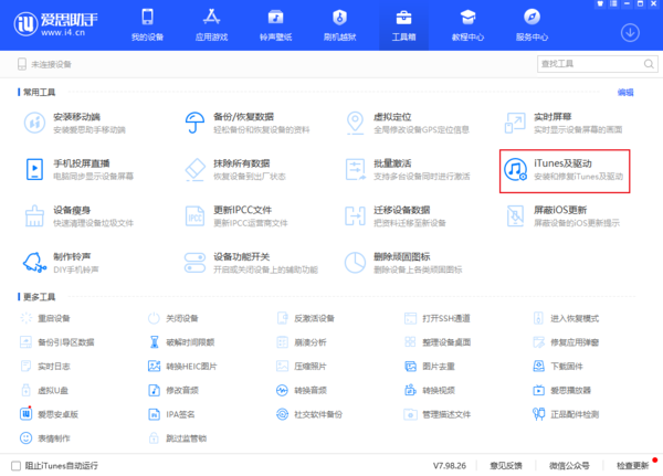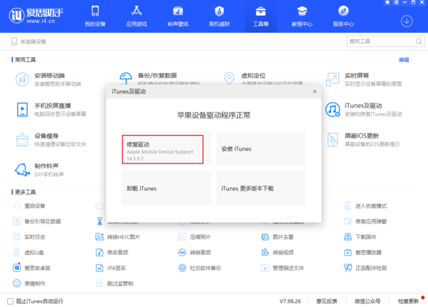 如果经过驱动修复后,爱思助手依然无法连接设备,则需要手动检查电脑的驱动和服务是否正常运行,如果检查后均为正常,则需要卸载重新安装iTunes。