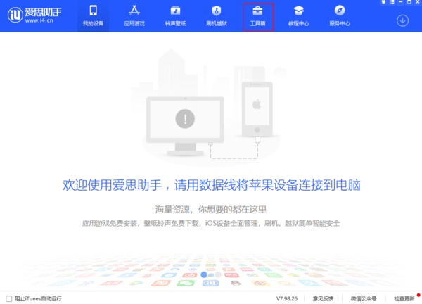 在我们用数据线将移动设备与电脑连接之后,爱思助手没有识别出设备,并提示“请用数据线连接苹果设备到电脑”,造成此问题的原因可能是移动设备连接不稳定或电脑中未安装苹果驱动,请按下面的方法进行修复。