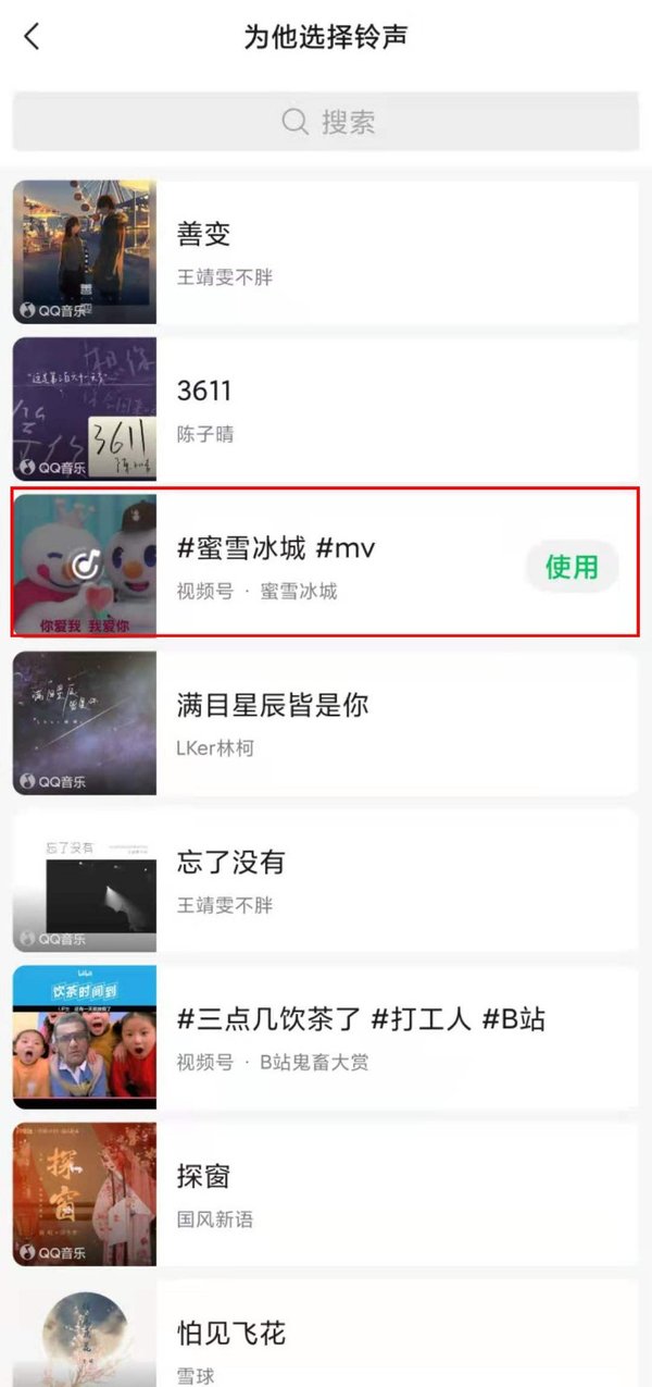在专属铃声设置页面,可以使用搜索功能寻找自己想要使用的铃声,选择铃声后点击使用即可将该曲目设置为专属铃声。