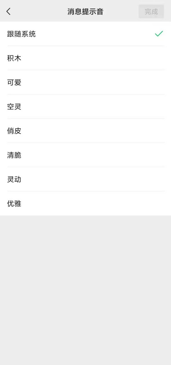 在消息提示音中,微信提供了8种选项,可以选择跟随系统,也可以选择微信提供的另外7种。