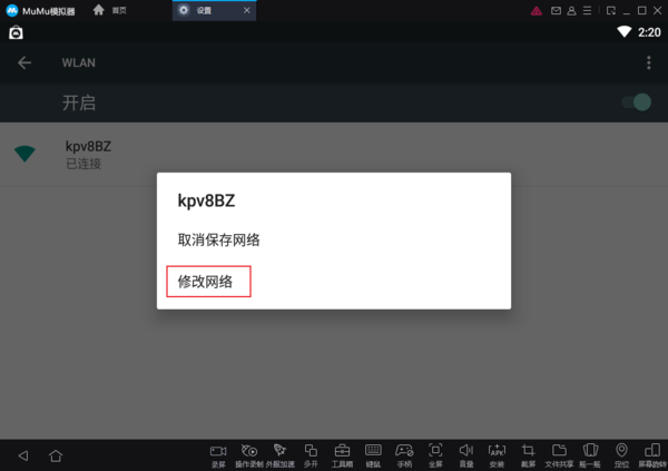 如果运行了网络修复文件后,网络问题依然无法解决,需要再次打开模拟器设置,进入WLAN设置,长按网络名称后点击修改网络。