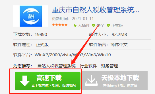 搜索完成后,我们点击“重庆市自然人税收管理系统扣缴客户端”的图式进入到下载页面,这里我们选择“高速下载”就可以开始下载安装包了。
