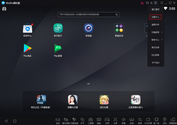 首先打开MUMU模拟器,点击右上角的菜单,选择设置中心。