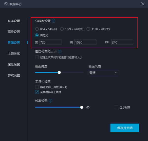 将分辨率改为自定义,设置宽高为720X1080,DPI240,点击保存。