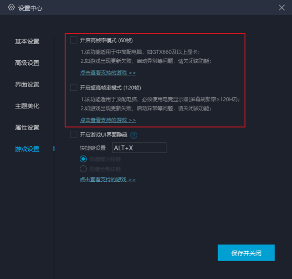 之后点击左侧的游戏设置,将开启高帧率模式功能勾选,之后点击保存并关闭。
