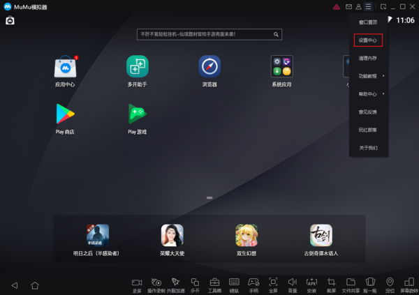 首先打开MUMU模拟器,点击右上角的菜单,选择设置中心。