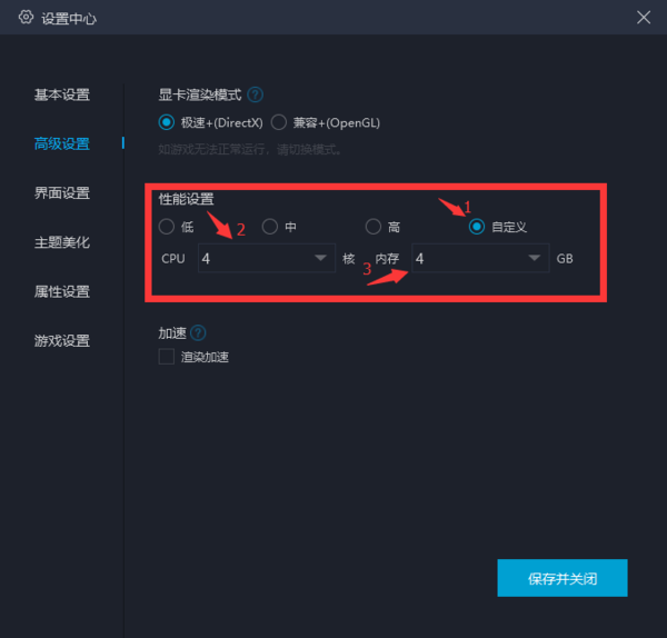 点击左侧的高级设置,将性能设置改为自定义,将CPU和内存都改为4。