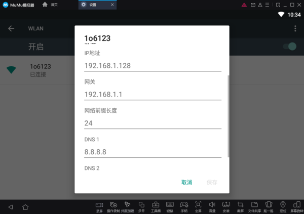 将IP地址更改为10.0.2.15,网关更改为10.0.2.2、网络前缀长度24,DNS?1:114.114.114.114,之后点击保存。