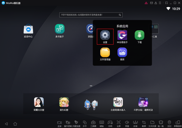 首先打开MUMU模拟器,点击系统应用,选择设置。