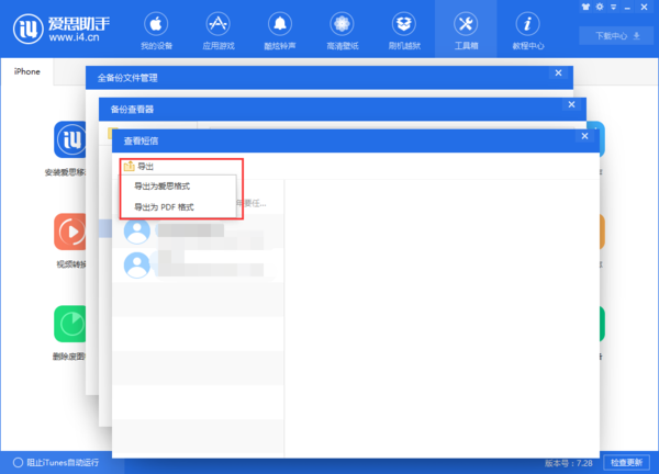 第六步,短信也可以通过爱思住的【备份查看器】进行查看,然后将其导出为PDF文件,接着双击短信中的SMS.DB即可进行查看了。
