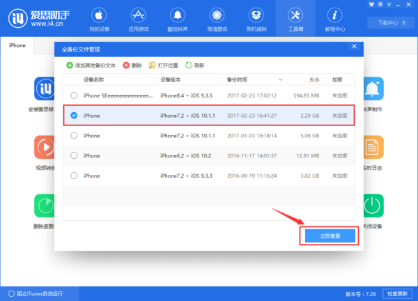 第二步,接着在弹出的全备份文件管理窗口中,选中需要进行恢复的备份数据,然后点击界面右下角的【立即查看】按钮。