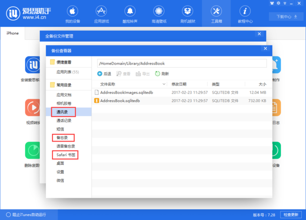 第五步,同样的,我们也可以使用上面的方法,来将全备份中的通讯录、Safari书签、备忘录内容导出后,到爱思助手的资料管理界面中进行备份数据的恢复了。
