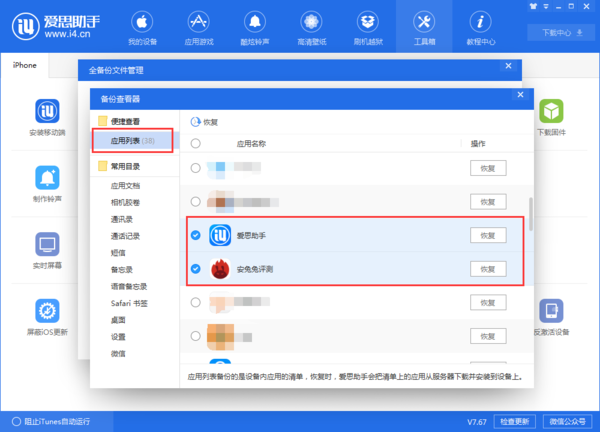 第一步,首先要确保的是,我们在爱思助手软件的【全备份文件管理】当中可以看到这个备份。具体的查看方法是,打开爱思助手软件,在【工具箱】中的【备份恢复】选项中,打开【全备份文件管理】选项。