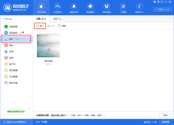第四步,接着回到【我的设备】界面中,点击【照片】,然后再点击界面上方的【导入】按钮,接着选中刚才导出的照片,然后再苹果手机上打开【爱思助手】,并且允许爱思助手访问您的照片,就可以完成照片的导入了。