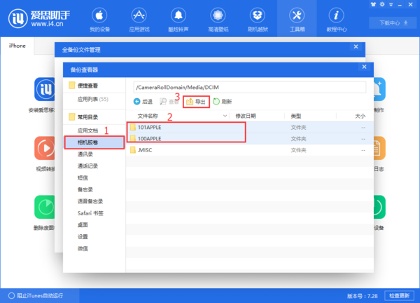 第三步,然后再弹出的备份查看器窗口中,我们就可以看到备份中的数据,点击【相机胶卷】可以查看到设备中的照片文件,选择照片中的文件,然后再点击界面上方的【导出】按钮,便可以将备份中的照片导出到电脑当中。