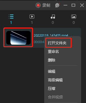 如果录制完成之后,不需要再进行编辑等额外操作,可以直接在选中文件后,单击鼠标右键,选择“打开文件夹”来查看文件导出保存位置。