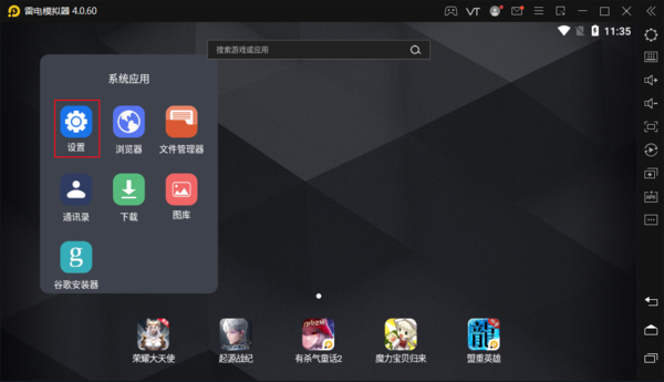 首先打开雷电模拟器,点击系统应用,选择设置。