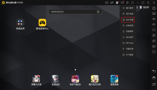 首先打开雷电模拟器,点击右上的菜单,选择软件设置。