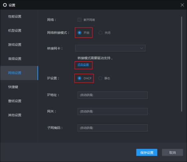 将网络桥接模式开启,IP设置改为DHCP,之后点击驱动安装。