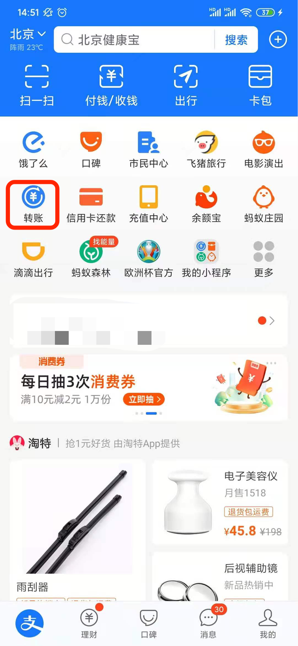 第一步,打开支付宝App,在首页功能选项栏中选择【转账】;