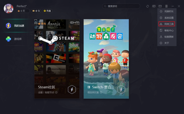 如果更改为英文目录后依旧无法连接,可以点击加速器右上的菜单选择网络工具。