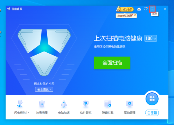 第一步,在电脑上找到金山毒霸软件,然后点击打开,进入到软件的主界面当中后,点击界面右上角的【三】菜单图标。