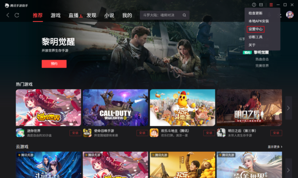 首先打开腾讯手游助手,点击上方的菜单,选择设置中心。