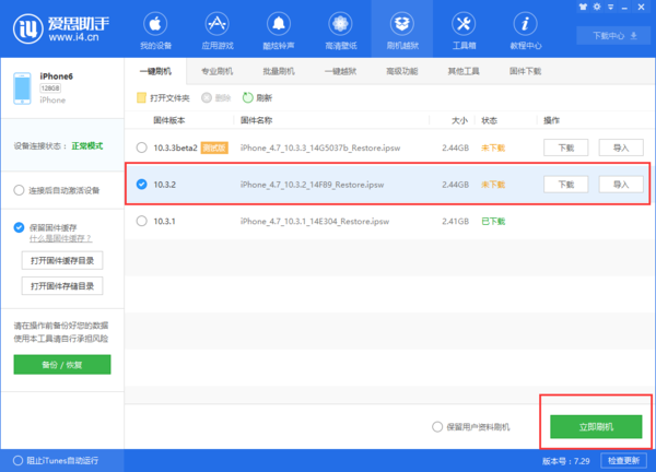 第六步,然后我们在可刷的版本固件中,找到想要更新的iOS版本,然后点击【立即刷机】功能。