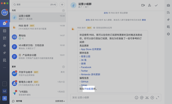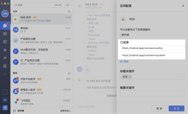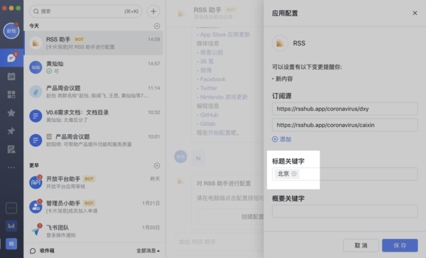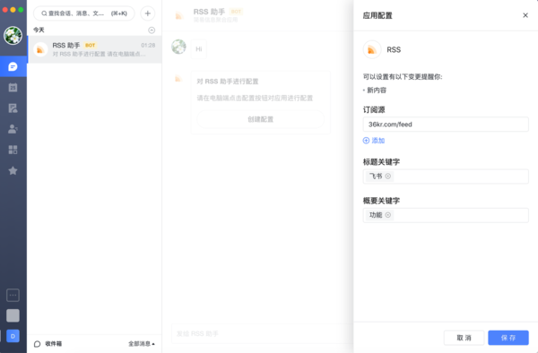 RSS助手是飞书团队开发的实用工具,通过RSS助手可以实现飞书与RSS的结合,在飞书中第一时间获取订阅源的更新内容。目前,RSS助手最多支持配置20个订阅源,10个标题关键词。