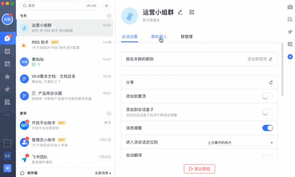 点击设置-群机器人,搜索栏内搜索RSS助手,并将RSS助手添加到群聊内。