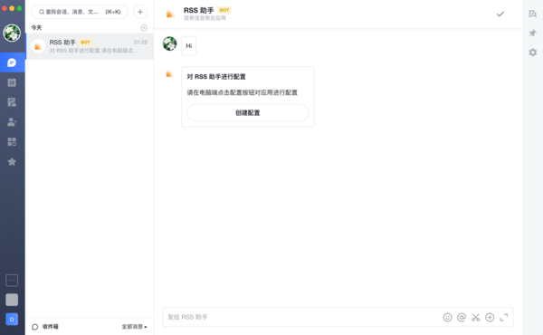 在与助手的对话框中输入任意文字,将看到对助手配置的消息卡片。点击消息卡片中的创建配置按钮,然后在配置页面输入订阅源链接,标题关键字和概要关键字后,点击保存即可成功设置任务。