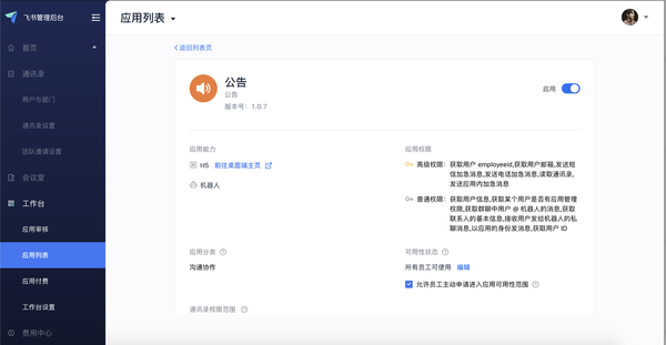 管理员进入飞书管理后台的应用?-?应用列表模块,可看到“公告”应用。点击公告进入配置页面,打开启用即可开通该应用。