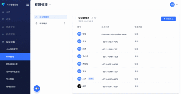 企业管理员进入飞书管理后台的企业设置?-?权限管理模块,点击左下角“+”按钮创建子管理员,设置权限为应用权限?-?公告。在公告管理员页面,点击“+添加员工”按钮,即可指定员工并设置管理范围。可以添加多位员工,并且分别对他们设置相应的管理范围。